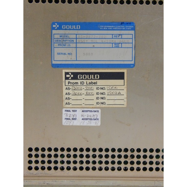 Module MODICON GOULD, il dispose de quatre sorties analogiques 4/20ma. Ce matériel a précédé la gamme SCHNEIDER TSX17, TSX37 micro, TSX47,TSX57 premium, TSX67, TSX87, M340.
